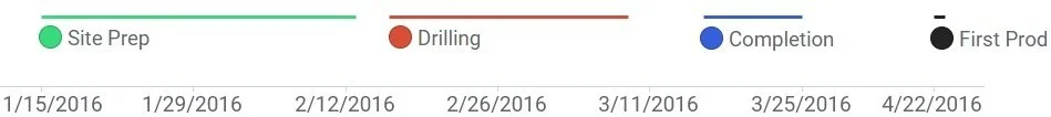 All data tables provided contain fabricated data. This example table contains data for 21 wells. Columns include well identifier information, measurements, and important dates. A typical well development timeline is below: